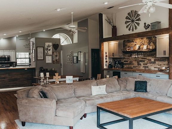Imagine living in your own beautiful custom home on 2 acres with out any deed restrictions! This 3 bedroom, 2.5 bathroom home is just under 2,000 square feet and features an open floor plan, real hardwood floors, vaulted ceilings, and a rustic farmhouse feel. The kitchen has stainless steel appliances, lots of cabinets and a breakfast bar counter. The Dining and Great rooms are very bright and open. There are seamless corner windows that allow the natural light in. The Feature Wall has a built in refrigerator and extra storage cabinets which adds a perfect finish to the room! There are French Doors that open to the covered wrap around porch that also connect to the French Doors off of the Master Bedroom. Both bathrooms have been updated. Newer A/C system. All screws on the metal roof have been replaced with heavier gage screws. The oversized garage floor has a nice epoxy finish. There is plenty of room to add a pool, a separate garage or workshop and so much more. You can add your own personal touches and make this your dream home. Don't miss your opportunity to own this beautiful property with mature oak trees. Located just far enough off the main highways but close enough to the growing areas to access everything you need. Survey and Seller's Property Disclosure are in the MLS attachments.