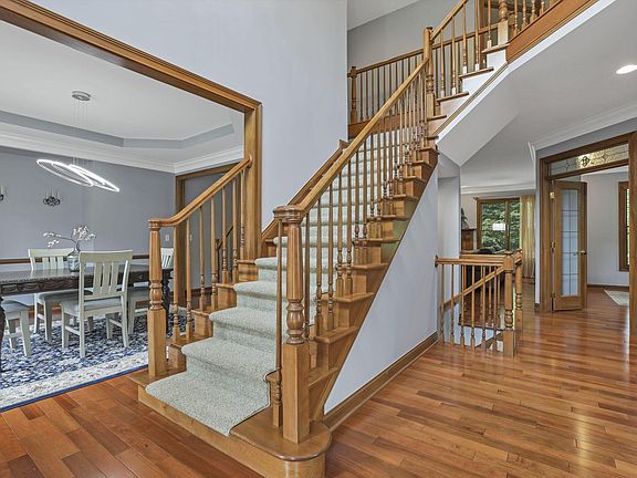 Impressive former model home loaded with upgrades including a new roof in '23 and HVAC in '22! Tucked away on a breathtaking ½ acre wooded ravine lot, this custom-built home offers nearly 5,000 sq ft of exceptional living space across three finished levels. The dramatic two-story foyer welcomes you into the spacious great room with rich mahogany wood flooring, and a dual staircases adds both function and elegance. The first-floor den/home office is ideal for remote work or quiet study. The expansive kitchen features wraparound cabinetry, large island, new quartz countertops and backsplash—perfect for entertaining. The spacious eat-in dining area overlooks the scenic backyard with access to the outdoor living areas, featuring a large deck leading to the paver patio.