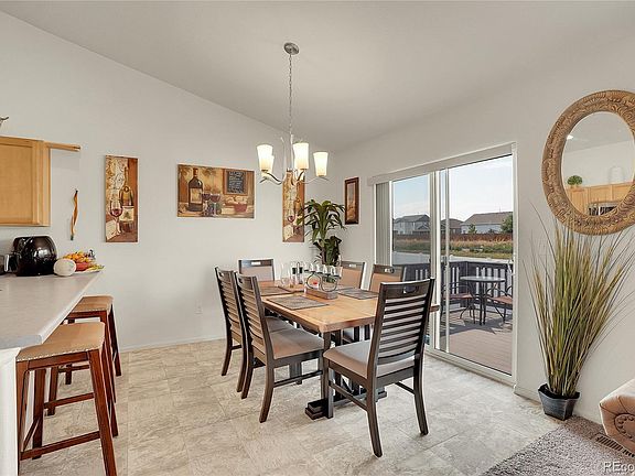 The dining area boasts a lofted ceiling, light tile patterned floors, and a chandelier. This space is perfect for hosting dinner parties or enjoying a quiet meal with family.