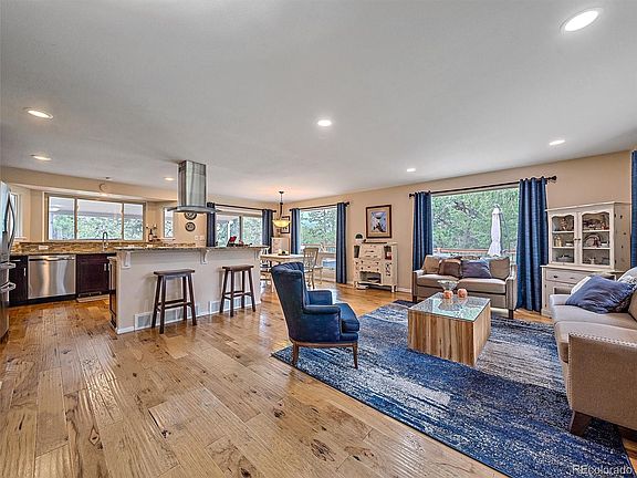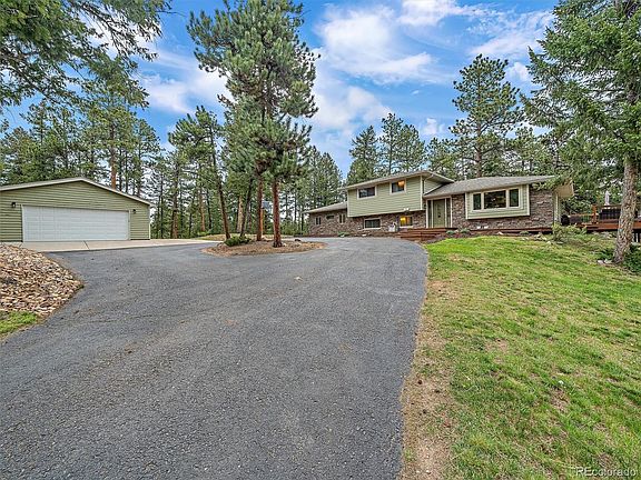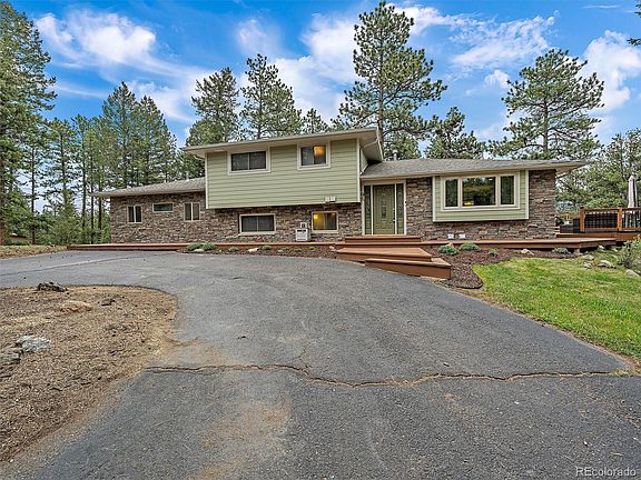 Beautifully remodeled 4 bedroom, 3.5 bath, mountain contemporary on a park-like 2 acre lot, in sought after Evergreen Meadows. This one will impress you the minute you venture up the long paved driveway. Talk about curb appeal! The exterior has been redone in Hardie Board siding and stacked stone. The front of the wrap around deck leads the way. The entry opens to the great room with recessed lighting, spotless hardwood floors and dual pane windows that fill this home with natural light. Looking onto the great room is the remodeled kitchen that will delight! Quality cabinets with soft close. Slab granite counter tops & tile backsplash. Under cabinet lighting, stainless steel appliances including the Elextrolux Oven with gas cooktop. Breakfast bar and open dining area. Up six steps you'll find two bright bedrooms, remodeled full bath and the guest suite with remodeled en-suite bath. From the kitchen, go down six steps to the wonderful family room with a beautiful fireplace. A remodeled laundry room that will make you smile. Half bath plus a bonus room that makes the perfect office, workout or studio. On to the private primary suite with romantic gas fireplace, walk-in closet and spa-like bath! French doors off the primary bedroom lead to the hot tub for relaxion. Enjoy the best wrap around deck ever! It's huge! Partially covered right outside the kitchen for the perfect alfresco dining area. Stone hardscape with flower beds accent the deck. The two acres are your private park. Towering ponderosa pines and aspens. There is a nice shed too. Plus the detached two car garage. Other features: Central AC 2021! Roof 2014. Furnace 2015. Hot Water Heater 2022. Hardie Board& Stone 2022. Well head 2023. The owners have loved, remodeled and cared for this home for the last ten plus years and it shows! This one is a must see!