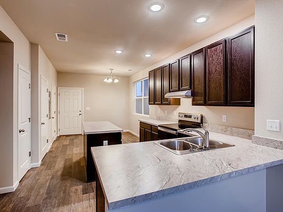 The Castor II paired home has 2x6 exterior walls, cement fiber siding, 7 ft. garage doors, and front yard landscaping included. It has stairs leading to the second level near the entryway of the home. The great room, dining room and kitchen have vinyl flooring throughout and showcase an open concept floor plan. There is a powder bath on the main level. The spacious kitchen will display 42" upper cabinets with crown molding, laminate countertops, a stainless steel drop in sink, 6 x 12 tile backsplash and a stainless steel range, hood and dishwasher. This home has an detached one bay garage and a patio off the back of the home. On the second level of the home, there is the owner's suite with a walk-in closet and attached bath. There is also a laundry closet upstairs and an additional bedroom and bathroom.