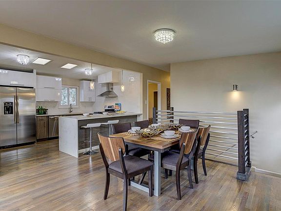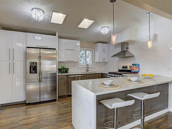 Mid Century Modern renovated to Perfection-Uber Hip+Cool+move right in!Gorgeous Contemp Kit designed with custom tile backsplash,modern custom cabs with pantry,beautiful custom Quartz counters with waterfall,S/S appls+kit breakfast bar for your morning coffee!Designer interior paint complements the newly refinished wood flrs+contemp lighting+original blonde mid century modern brick with brand new doors+hardware to complement. Open concept flrplan flooded with lots of sunlight is perfect blend of mid century modern to entertain between the Dining+Living.Master Bed features Barn door to priv LGE shower,trendy tile+double sinks+closet custom designed. Newly designed contem Guest full bath for the 2 add main flr bedrms. Fully Finished Bas with LGE Rec rm,Custom Bar with Quartz counters.2 Beds both with egress windows+share Reno'd 3/4 bath.New Furnace+H20.Brand New 2 Car Garage,Resurfaced Roof+Gutters,Exterior Paint.Fab fenced yard designed with Trek deck+sprinkler-perfect for summer BBQ's