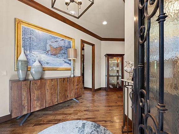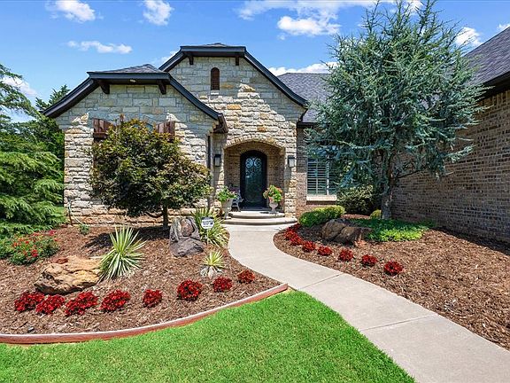 Stunning custom one level home with a perfect blend of eloquence and comfort on over an acre and a half. The living room has a vaulted ceiling with a magnificent stone fireplace to the ceiling and an inviting warm hearth to sit and enjoy the fire. The living room and kitchen are flooded with natural light from the large windows that overlook a private backyard. The kitchen is exceptional with an extended wall of pantry, multiple cupboards, double ovens, pull out drawers, built in recipe desk, and a glassed china display hutch. The kitchen and living room flow together, perfect for entertaining/gathering place. Large island with bar seating, and a beautiful coffee bar with cupboard nearby. Gorgeous wood floors throughout. Primary suite has large bathroom with two walk-in closets, walk-in shower and soaking tub. Lovely large study. Three other bedrooms with one currently being used as media room. Large media/game room could be used as a live in guest suite with private full bath. One extra room is for you to decide, flex room, TV room, workout room, or play room you choose. An oversized garage is a man's (or woman's) dream with storm shelter. Water softener is 6 mos. old. Access to attic storage with stairs in garage not a pull down stairs. This homes' one level floor plan is special and very livable. This acreage is bound with lovely trees and backed with shrubs creating wonderful solitude. Provence neighborhood is a beautiful gated private street in and out. You will love your new home and area!