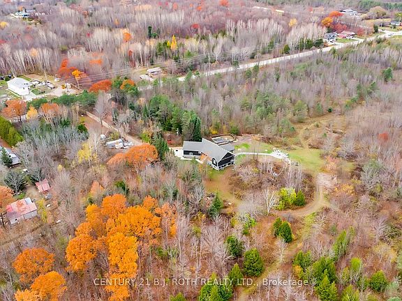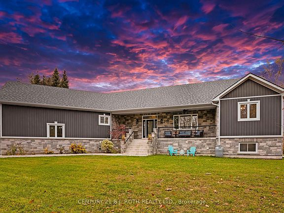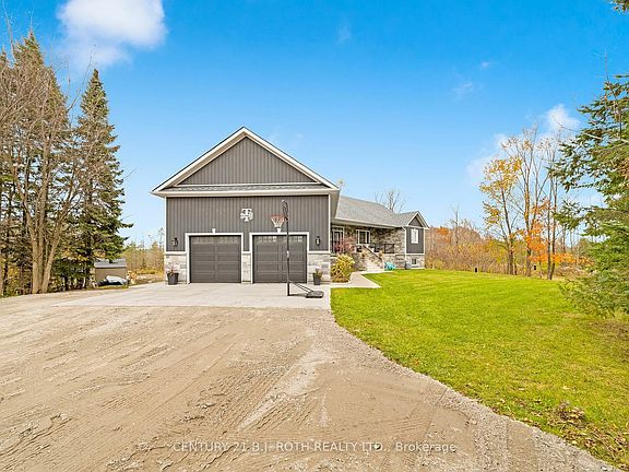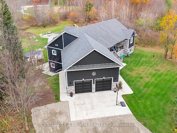 Custom-built 3+2 bedroom bungalow with a walk-out basement on almost 30 acres between Midland and Port McNicoll. This beautiful property has frontage on Talbot Street and Triple Bay Road. The home features an open-concept living area with a modern white kitchen featuring a granite-topped island, pot lights, crown moulding and 9' ceilings. Walk out to the covered balcony. The main floor also features a primary bedroom with an ensuite bath, two additional bedrooms, a main bathroom and a laundry area. Separate entrance to the fully finished basement with heated floors, two bedrooms, kitchen, cold cellar, walk-in pantry, bathroom and spacious living area with a walk-out to the covered patio. This corner location offers the potential to create additional lots, and it has a unique investment opportunity in a rapidly growing community. Over 3600 square feet finished on two levels, municipal water available at the lot line, treed and private property, close to shopping and Georgian Bay. 2 kitchens, five bedrooms, walk-out basement, A/G pool, built 2019.