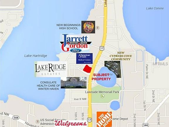 5 Minutes to Winter Haven Airport, all the infrastructure you need to build a new clinic, rehab center, research and development, Private parking for 170+ Great location 240 ft HWY frontage, 330 ft street access. Access to Lake Ridge Estate and Consulate Health Care. Great SOLD AS IS, Defined use; FUTURE LAND USE Hotel/motel Business office Medical/health care office Personal services Professional office Hospital Recreation indoor, public Social center/museums Vocational Tech school University/college Antique shops Bake Shop Retail sales Retail Shops Parking lot Recreational Vehicles sales & Service Radio Television studios and offices Research & Development Public buildings & Grounds/public facilities. Think outside the box!