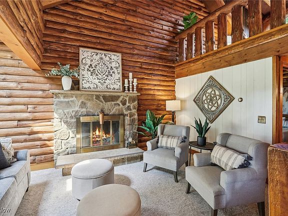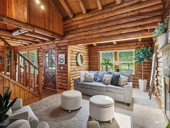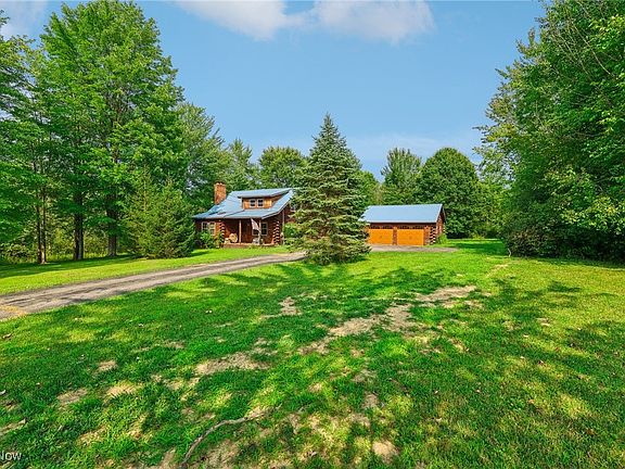 This picturesque log home on over an acre sits right on the Cortland/Warren line. Convenient to both towns, yet in a private rural setting, and just a 10-minute bike ride to Mosquito Lake State Park with its boat docks, disc golf course, swimming beach, playground, dog park, and fishing pier. This home is perfect for a relaxing rustic retreat or a comfortable year-round home. One bedroom downstairs, and two upstairs, one and a half baths, a full basement with laundry, storage, and rooms that could be finished for more living space. The 1300 square foot house is centrally places on 1.33 acres of mostly clear, but pleasantly shaded yard. Well set back from the road, with plenty of room behind the house, too, for gardening and sports activities. A detached two car garage and a shed provide plenty of additional storage. Brand new stainless steel range, refrigerator and microwave added since the photos were taken, and a brand new septic system installed summer of 2024. Treat yourself to seasons of outdoor entertainment on the large deck and spacious grounds, and cozy comfort by the stone fireplace or the overlooking loft when the weather the weather turns cold.