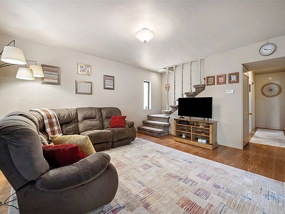 Charming two-story home with a covered/enclosed front porch inviting you to relax and enjoy natural light-filled spaces. Inside, the main level boasts a spacious living room flowing into a bright dining area and a beautifully updated kitchen featuring granite countertops, upgraded stainless steel appliances, ample cabinetry, and plenty of counter space for meal prep or entertaining. Two generously sized bedrooms and an updated full bath complete the main floor. Upstairs features a versatile loft, two more bedrooms, and another updated bath. The partially finished lower level offers extra living space, ample storage, and a laundry area. A side porch leads to a fenced yard with off-street parking in the rear. swing set stays with the property