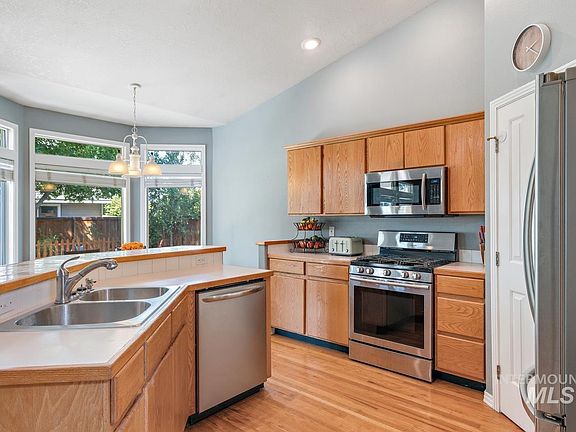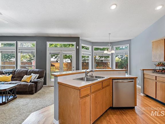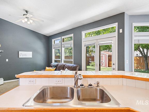 Charming single-level, corner lot home, in a central Meridian location. Space-maximizing, split-bedroom layout features vaulted ceilings, hardwood floors, bedrooms w/ window seats, naturally light-filled home office/bonus room, skylight, planter shelves & more. Inviting open kitchen (w/ breakfast bar, tile counters, NEW sink & pantry) flows seamlessly into welcoming living room complete w/ a cozy gas fireplace. Owner's suite offers oversized walk-in closet, dual vanities, soaker tub, walk-in shower & direct access to the patio. Retreat outback (to entertain or sit back & relax): BBQ, extended patio, storage shed, raised planter beds & abundant fruit & vegetable bearing plants: pumpkins, strawberries, squash, peppers, pears & more. Extended garage w/ built-in storage plus extra storage space in the attic. NEW furnace. All tucked in the well-established Fieldstone Meadows neighborhood - minutes from great parks (Tully, Fuller, Chateau, Settlers), golf (Lakeview Golf Club), shopping (the Village) & more!