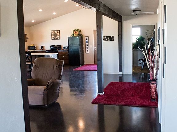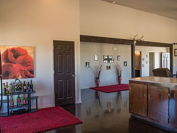 Amazing 12.5 acre property & custom home in Derby Ranch subdivision! This is a custom built home with many designer touches featuring an open floor plan concept, beautiful glazed concrete flooring, creative & interesting fireplace in the Living Room, wood beams throughout, 2 large bedrooms, 2 baths, Master Bedroom includes walk-in closet, sliding barn door. There is also a covered front deck and covered back patio, with really awesome views from every angle!!