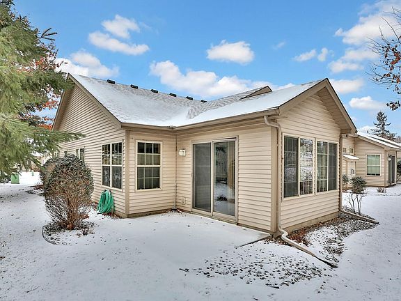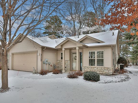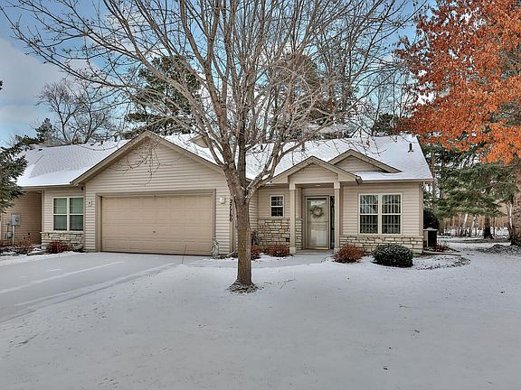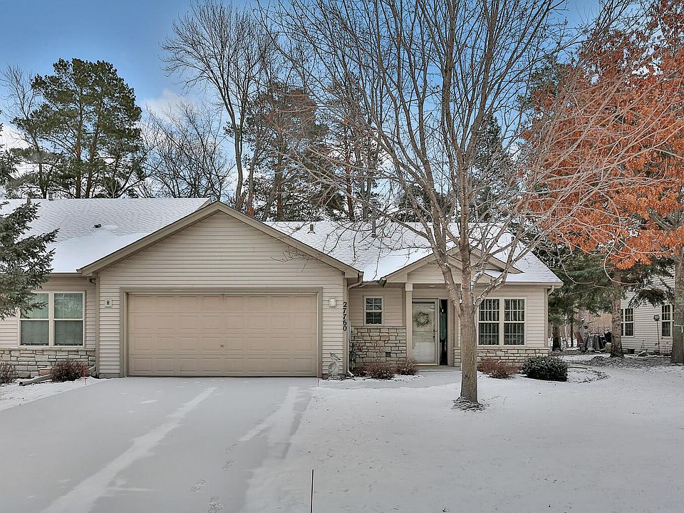 Welcome to Ridgepoint Townhomes on the shores of Green Lake in Chisago City! This end-unit townhome has MUCH to offer! No steps - all amenities on 1 level! Enjoy hassle-free living with no more mowing or snow removal! This unit boasts a spacious living room with vaulted ceilings, a gas-burning fireplace, dining area. Large kitchen with wood flooring and space for a kitchen table. Sunroom exits to the back yard which borders a wooded area - 2 Bedrooms - Primary bedroom with a large walk-in closet and huge walk-through full bath with separate tub and shower. Custom window coverings - PLUS- residents enjoy the lake features available to them! Boat slips upon availability for additional fee - Use of the Cheewin Lodge with full kitchen-generous seating for larger gatherings, patio with outdoor tables overlooking the lake with an outdoor elevator to access the docks and beach for residents' use. This is truly the best of all worlds!