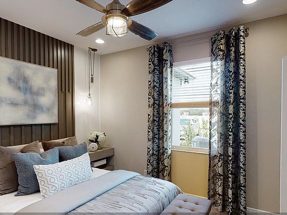 The outdoor patio has a lake view and an upgraded lanai to sit and relax while enjoying breathtaking views. It has a 2-car garage, coach lights, and can easily fit additional cars on the driveway. The house also has an outdoor sink rough-in, a soft water loop with hard water to hose bibs, a blinds package, and a smart home base automation package & security package.