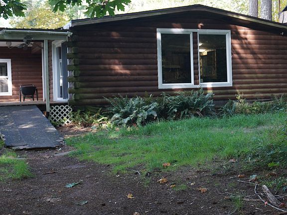 Your own slice of paradise! 1911 sq. ft. manufactured home on 5 beautiful acres of trees. Two bdrm (was 3, but dividing wall removed)2 bath. Spacious living rm, family rm and master bedrm. Tons of built in bookshelves. Huge detached barn/garage with 2 separate workshop areas and room to park multiple cars. Room for an RV. Enclosed area for wood/equipment. Property surrounded by tree farms. Home needs some updating /repairs. Sold as is.