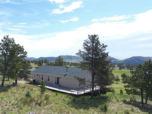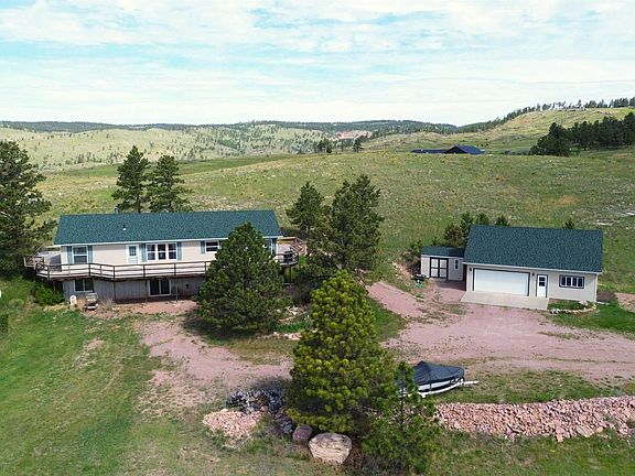 Welcome to your beautiful home in the Black Hills where you can enjoy the peace and tranquility of country living with the convenience of being just minutes from town! This 4 bedroom, 3.5 bath, 3,200 sq ft home is situated on 10+ acres that adjoins the National Forest Service and boasts incredible views of the Seven Sisters Mountain Range, Sheps Canyon area, Flagpole Mountain, and the Nebraska hills. The main level offers a spacious, open concept kitchen with several new appliances, dedicated dining area, and living room with plentiful windows to take in the scenery, a cozy fireplace, and access to the wrap around deck providing breathtaking views of the sunrises and sunsets. The primary bedroom has an ensuite bath with garden jet tub and walk-in shower. There are two additional nice sized bedrooms on the main level as well. The cozy family room on the ground level has a pellet stove with custom flagstone hearth and rough-cut pine planks adorn the walls and ceiling. It also has large windows and a patio door to allow lots of natural light. There is a fourth non-conforming bedroom and full bath. The utility room, large pantry area, and work/hobby room on this level are versatile spaces that provide much storage and an option for additional bedrooms if desired. The 24x36, 2 stall garage has a separate heated workshop, loft storage and there is a 10x14 storage shed as well. All structures have new roofs of high impact, class 4 shingles, eaves, downspouts, and siding in 2024.