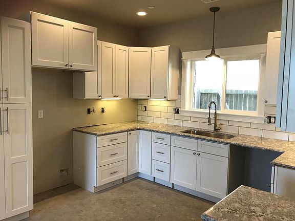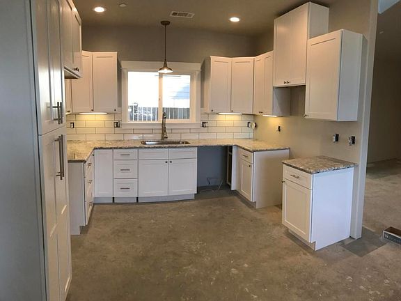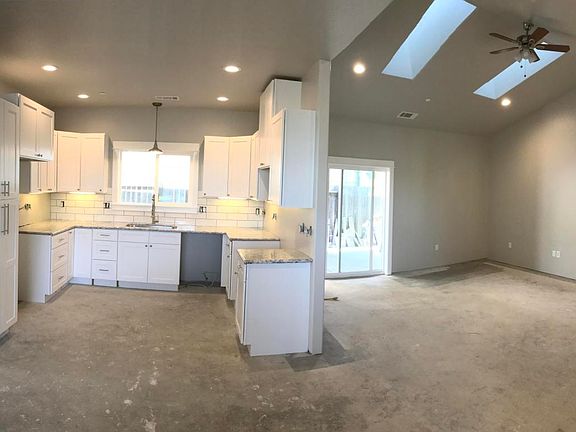 Just finishing up, but you can see the attention to detail throughout. This brand new 2x6 construction boasts upgraded windows, 9' ceilings, white cabinets with soft close hinges, granite counters, high quality laminate floors, custom tile floors & surrounds in the bathrooms. Master suite has crown moulding, double barn doors, double vanity and a walk-in full tile shower with glass doors. The Living room has vaulted ceiling with LED recessed lighting, and a sliding glass door to the large back covered patio. Front and back patios have stained pine ceilings and additional lighting. Corner lot with garage side entrance to the house, and dramatic roof lines, gives a very nice presentation to any guest. The garage is oversized, 24x24 and is fully finished with a separate closet for utilities.