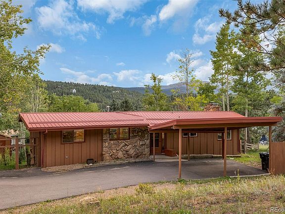 Truly in the heart of Evergreen! Delightful living room with a wall of south facing glass, native granite fireplace, and high beamed ceiling. Three Bedrooms on the main level including the Primary Suite with direct access to the deck. Updated kitchen with newer soft-close cabinets, appliances, and granite counters. The three baths have also been updated including a steam shower and a rain shower. Zoned hot water baseboard heat plus two wood burning fireplaces will keep you cozy when your aspen trees start to turn gold. The family room has an efficient wood stove insert framed by a gorgeous Becker dry stack hearth and a wall of accommodating built in cabinets. Mountain views in every direction and especially from the mighty wooden deck. Sunny Southern exposure is buffered by graceful aspen trees that provide summer shade and don't impede the sunshine in the winter. The orientation of this home also provides the perfect opportunity to add solar panels to the stout steel roof. Gardening opportunities abound in the Parklike backyard where a tall fence keeps the little ones in and the big game (flower eaters) out. Loads of storage in the crawlspace accessed via a full size door in the basement. The carport / covered entry provides vehicle protection and will keep you dry in inclement weather. Mountain living with dependable all city utilities and county/state maintained roads make this choice easy. Short stroll to the community playhouse and a brewpub/dining....and just a bit further to main street restaurants, live entertainment, and Evergreen Lake/hiking trails. No HOA covenants allow for full enjoyment of your property. Yes, it is definitely cooler 1,791 feet above the Mile High City so Move up to EVERGREEN and start enjoying the Colorado sunshine, fresh air, wildlife, and abundant trees.