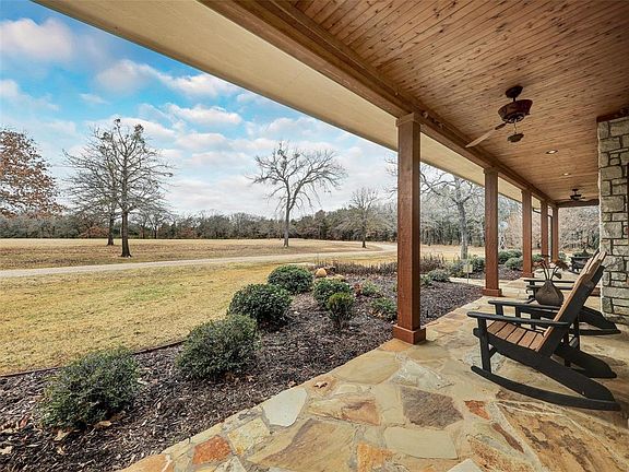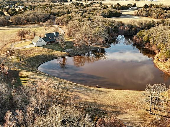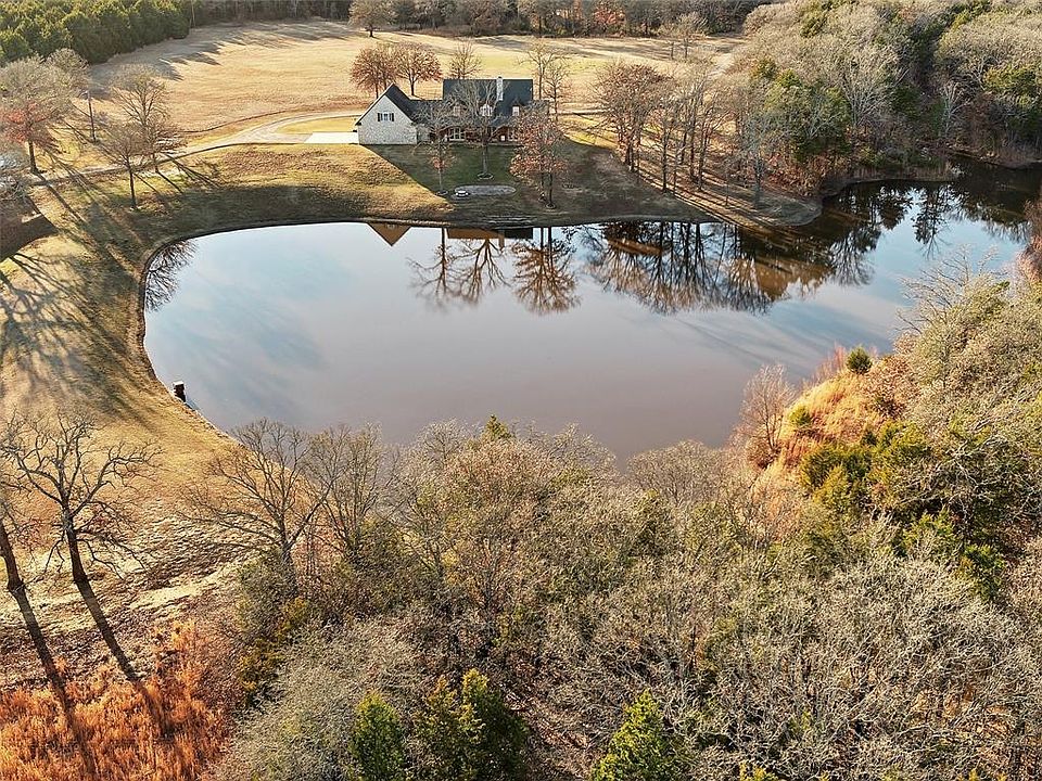 Don't miss this Beautiful Texoma Country home! Enter your electric gate to private completely fenced AG EXEMPT property. Sandy loam soil, trees, pastures, 30x40 shop with utilities. South property line borders Army Corp of Engineer of Lake Texoma. Main home has picturesque views of 3+ acre stocked lake with 4 bedrooms, 3 full and 1 half bath, and a wood burning stone fireplace to keep your winter toasty. Hardwoods, granite, subzero fridge, open family room to kitchen concept for easy entertainment. The guest suite is over garage with separate entrance, kitchenette, living area, 1 bedroom and a full bath. Easy access to popular horse trails, many full service marinas close for your water sporting and fishing.