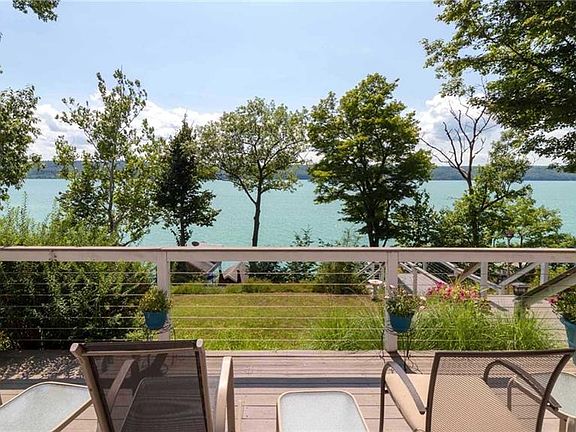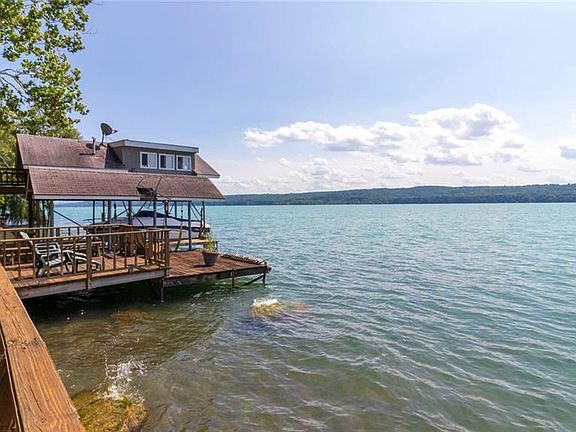 Beautifully updated home with 111 feet of pristine Cayuga Lake waterfront. Fabulous gradual lake frontage with exceptional dock and elevated boathouse with living space, kitchenette, and 1/2 eco bath. Inside, you will find all the amenities you could hope for in a lakefront home. Updated kitchen with granite countertops opens to the enormous family room with hardwood floors, stone fireplace, and expansive wet bar. Upstairs, you will find two good-sized bedrooms with updated bath to share, and a master bedroom suite fit for a king and queen! Vaulted ceilings, private waterside balcony, full glass tiled bathroom with separate shower and soaking tub, large walk-in closet, and wing for office or additional sleeping space. Gorgeous screen porch and so much more! Make this yours today!