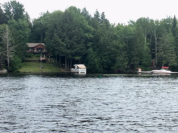 Sensational 2.78 acre point as the Saranac River enters Lake Flower. Views down river of Lake Flower and up river of High Peaks. Adorable, year-round home with huge deck for entertaining has one bedroom and a full bath. Large garage with bunkroom is heated and has half bath. One room Sleeping cabin. Multiple outbuildings. Great boat docks. private boat launch. Spectacular location, best use maybe to build a new house on the large, flat, point with views in all directions and use existing home as a guest house.
