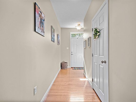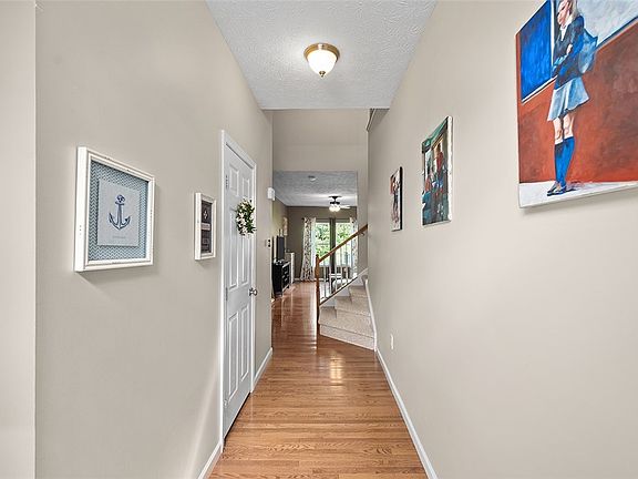 Turnkey townhouse in pristine condition. Sun-filled entry w/powder rm & unobstructed view of wooded area behind home. 18' ceiling divides entry/LR, setting the tone for an open concept living space that manages to maintain its warm & inviting feel. Oversized wdws, w/private wooded views, highlight hw floors that are found thruout the main lvl. Roomy kit has raised brkfst bar w/seating for 3-4/sleek stainless appliances/door to 2-car gar for easy grocery unloading. Kit is completely open to DR that easily fits a large table plus door to 19x10 deck w/privacy fencing & stairs to a true yard. Primary ste has plush neutral carpet/9x6 walk in clst/ensuite with dual vanity & jetted tub. 2 addl 2nd lvl brs plus convenient ldry rm. Spacious daylight GR, currently a home gym, has wet bar w/butcher blk top, LVF & barn door to full bath. Dbl driveway plus plenty of guest pkg nearby. HOA covers Grass Cutting/Mulching/Roof Repair & Replacement. Move right in & start enjoying maintenance free living.