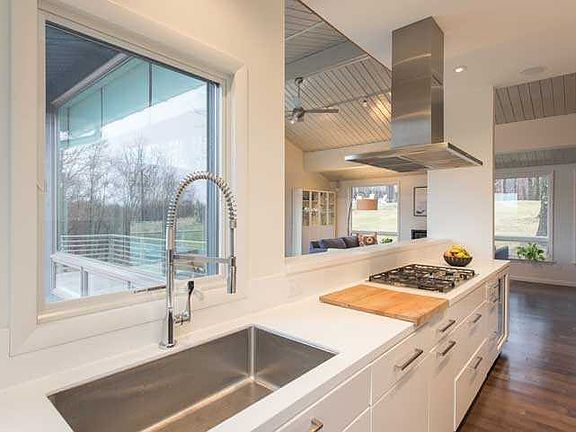 Stylish, renovated contemporary with a mid-modern flair is sited privately with panoramic Catskill Mountain views on 16 acres in Milan. Main residence offers open floor plan with chef's kitchen that features Sub-Zero refrigerator and wine cooler; Miele countertop gas range, hood, dishwasher and built-in oven; and breakfast bar. Living and dining room are open with fireplace, vaulted ceiling of exposed wood and double French doors to large deck that overlooks pool. There are custom built-ins with walnut finishes and upscale lighting fixtures. Master bedroom is also vaulted and offers breath-taking western views. It opens to an elegant master bath with glassed-in shower, free-standing soaking tub and radiant heat floors. In addition, there is a second bedroom and hall bath with laundry facilities. For visitors, there is a detached one-bedroom guest house with bath set discretely away from the main house. Steps from the residence is a heated, saline pool accented with modern fence surround that enjoys western vistas. Enjoy nights at the fire pit that overlooks the pool. Lastly, there is a 2-car barn/garage with storage for landscaping equipment. The property features natural landscaping with perennial gardens, mature hardwoods and stone outcroppings and stone walls. In addition, there is a playing field below the main residence, large enough to accommodate a soccer game. The property is minutes from Rhinebeck, Red Hook, Amtrak and the TSP.