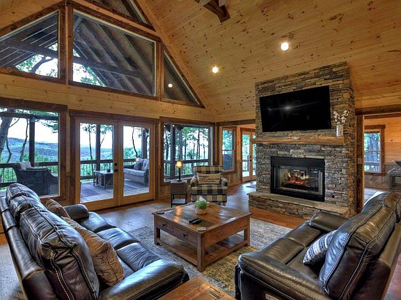 What does the perfect cabin look like? It starts with incredible long-range mountain views from the comfort of your large deck overlooking 220 acres of USFS. This meticulously-maintained, custom-built home offers extras like vaulted ceilings, an over-abundance of windows, open floor plan on main, 2 decks, bumped-out deck for the hot tub, 3 fireplaces, wood floors on main, LPV floors on lower level, and more. Main floor features vaulted LR w/ pass-thru stacked stone FP (gas), access to deck w/ FP (wood), half bath, large DR surrounded by windows, & kitchen w/ island seating, granite c-tops, S/S apps, & farmhouse sink. Vaulted primary BR suite on main w/ deck access plus en suite: dual sink vanity, freestanding tub, step-in shower. Lower level: den w/ gas FP, kitchenette, 2 BRs (1 w/ en suite, 1 w/ access to 3rd full BA). Property @ highest ridge pt. On paved road. Comes fully furnished.