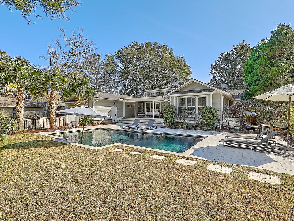 The outdoor space is the bomb! A long covered porch off the master bedroom and living room is a great spot to enjoy a cup of coffee or libation. The inviting pool has lounger chairs & can be heated in the winter months and cooled in the summer months to be enjoyed all year round. The garage has a ping pong table for hours of fun!