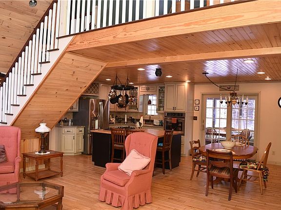 This 5 acre privately set home built in 2012 is everything you have been waiting for! Known for its signature design that features beautiful open concept with pitched cathedral ceilings and loft from the moment you walk through your door, custom hand glazed maple kitchen with stainless steel appliances and large island, first floor laundry, first floor master bedroom with en suite and walk in closet and guest/ 2nd bedroom with walk through full bathroom, downstairs is lined with hand scraped birch flooring, granite counter tops, and exquisite light fixtures, walk up stairs to a cozy loft bonus room with 2 bedrooms and half bath,full finished basement with second kitchen space and bedroom with full bath. Two stall garage. Located in Adirondacks next to snowmobile trails and close to Albany.
