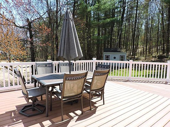 LARGER THAN IT LOOKS...This move in ready cape style home is located on a country road on a 1.2 acre wooded lot....offering lots of privacy and space! Features include an open dining area and kitchen with a center island, living room with a bay window and wood flooring, possible master bedroom on the 1st floor (currently being used as a playroom/office), 3 bedrooms on the 2nd floor one with a walk in closet, 2 spacious full baths and a partially finished walk out basement perfect for another family room area. Enjoy the outdoors on the newer large wrap-around composite deck, ideal for family gatherings. Wooded backyard and storage shed. Back side of the roof is 2016, newer hotwater tank. Car port area under the deck could easily be enclosed to create an oversized garage. Put this one on your list to view!