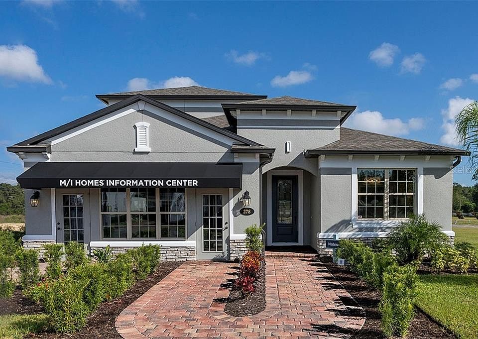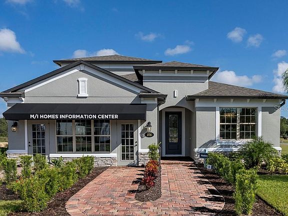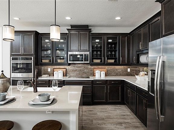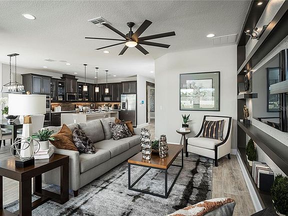 This model home features 3 bedrooms, 3 baths on the first floor, and a bonus room with a full bath upstairs. Enter thru the leaded glass front door and you'll enjoy views all the way to the back of the home. Just off the foyer is a bedroom, a full bath, 2 linen closets, and the flex room, currently used as a formal dining room. The wood accents and beams on the ceiling, the double chandeliers, and the custom room dividers really accent this space. The third bedroom boasts its own bath, perfect for guests. In the kitchen enjoy tons of cabinetry, a glass backsplash, and GE® built-in double wall ovens. The island showcases quartz countertop, a white cast iron farmhouse sink, and stunning waterfall edge. Access the extended lanai via the breakfast nook, to find the built-in fire pit with extended brick paver deck. So many details: wood-look tile flooring in the main areas, oil-rubbed lever hardware on all the doors, 5 ¼" baseboard, custom paint job, and tons of special trim details. The owner's suite wow's you with its tray ceiling, ceiling beams, and crown molding. The detail continues into the en-suite bath, with its soaking tub and separate shower with tile extending to the ceiling, a full wall of accent tile, and the semi-frameless enclosure. You'll want to hang out in your massive walk-in closet with custom wood shelving. Head up the espresso-stained wood stairs to the bonus room, which is finished off with engineered wood flooring. There is a full bath for added convenience. Contact us today!