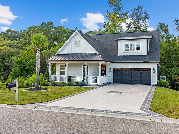 Experience the pinnacle of sophisticated, upgraded living at 278 Rivers Edge Dr, a spectacular 4-bedroom, 2.5-bathroom residence custom-built by Chase Signature Homes within the coveted gated community of Rivers Edge Plantation. This home is a sanctuary of high-end finishes and superior design, where a breathtaking living room features a built-in gas fireplace, a vaulted ceiling, and accent beams. The gourmet kitchen is an entertainer's dream, boasting two expansive islands, granite countertops, stainless steel appliances, a pantry, and abundant custom cabinetry, complemented by a chic custom built-in bar with a wine fridge. Retreat to the luxurious master suite, which offers a tray ceiling, an enormous walk-in closet, and a spa-like bath with dual sinks and a walk-in tiled shower. Three of the four spacious bedrooms are large enough to accommodate a king bed with extra space for a sitting area or office, while the fourth fits a queen. Engineered for comfort and durability, the home is part of a natural gas community, features a pristine epoxy coating on the garage floor and driveway, and includes a split unit A/C for heating/cooling the garage. Outdoor living is exceptional, with a total of three covered porch areas and two open-air porch areas. The rear outdoor space has been significantly enhanced with an extended back patio featuring stamped concrete, a covered shaded area, a dedicated sunbathing area, and easy access to the yard via installed stairs, all while maximizing views of the adjacent stream and river. The yard is well-maintained with a Rainbird sprinkler system, gutters with two underground drains, and a huge raised rear concrete retaining wall. For ultimate peace of mind, the front yard features a fully fenced front patio for pet or child safety. Best of all, this home offers an unparalleled, direct next-door location to the community boat ramp and dock, and is not in a flood zone, has never flooded, and does not require flood insurance, allowing you to enjoy resort-style community amenities like the clubhouse, pool, and playground worry-free. Bonus features: Option to convey furnishings and decor with the house for a negotiable price 2-Person Sauna Built-in wine bar Beautiful stream with abundant nature sightings (owls, otters, herons & more!) Short drive to the beach, restaurants, and shopping, and only 5 minutes to miles of hike & bike trails
