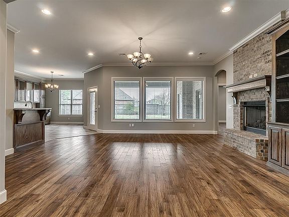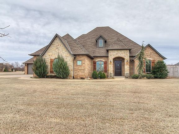 Nestled on a corner lot with nearly 9/10 of an acre, this home combines elegance, privacy, and convenience. The beautifully landscaped front yard will capture your attention as you make your way to the 8’ custom entry door complete with a speakeasy. Step inside onto the hand-scraped wood flooring and you'll see the entryway is merged with the formal dining area, a perfect space for entertaining and special events. The wood flooring extends into the study, which will be immediately to your right, with windows overlooking the front landscaping, a cathedral ceiling, and floor-to-ceiling built-in bookshelves. The wood flooring continues into the living room, where you will see the gorgeous brick fireplace, and 3 giant picture windows overlooking the huge covered back patio. Partially open to the living area, the kitchen has granite countertops, a 5-burner gas cooktop with a built-in microwave and oven, and a spacious pantry. On the other side of the living room is the hallway to the master suite with a double tray ceiling, private patio access, granite countertops, luxurious zero-entry tiled shower, elongated jetted tub, separate toilet room, and a huge closet with 2 built-in dressers and a full-length mirror. Upstairs, is a giant bonus room with a full bath and walk-in closet. Not only does it have zoned heating and cooling but the spray foam insulation will help you keep your comfort high and your bills low. The secondary bedrooms provide comfort and privacy, each with a walk-in closet and private full bath. Even the laundry area turns the mundane into an experience, with gorgeous leathered granite countertops, tons of cabinets, and a hanging space. The expansive backyard is fully enclosed by a cedar privacy fence and includes a small fenced garden area. Located just 2 minutes from I-35, close to Pryor's Pizza Kitchen, and a short 5-minute drive south of Norman, this home offers unparalleled features and a prime location.