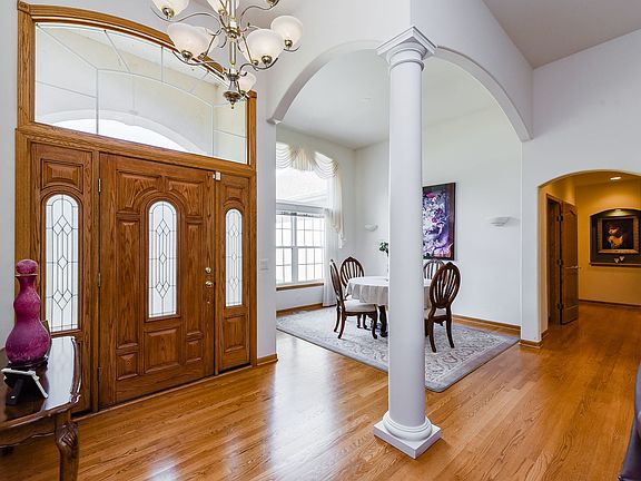 Spectacular custom ranch! You will love the open floor plan with soaring 12 foot ceilings, recessed lighting, and high end finishes throughout such as solid wood doors, rounded drywall corners, recessed lighting, built in tv and art niches, and surround sound system! The great room is the center of the home boasting a wall of windows, hardwood flooring and beautiful gas start fireplace. The spacious kitchen has been upgraded with granite counters, backsplash and newer stainless appliances ( with exception of dishwasher which has never been used ). The lovely kitchen eating space overlooks the private backyard with maintenance free concrete patio and grilling station, ready for summer entertaining! Wait until you see the stunning master suite - this is a true retreat with volume ceiling, ceiling fan, big walk in closet, Jacuzzi tub and separate shower and water closet, and double bowl vanity. 2 additional great sized bedrooms on the opposite end of the home boast excellent closet space, volume ceilings and ceiling fans. 1st floor mudroom is right off the garage and features a built in wash tub with cabinets, and newer front loader washer and dryer on top of matching storage drawers. The absolutely massive basement is an entertainers delight with a beautiful custom wet bar featuring built in wine fridge, sink, and plenty of cabinet space. A full bathroom and tons of storage are also featured in this huge, flex space basement. This home is in immaculate condition and is move in ready. The 3 car garage is current set up with a handicap accessible ramp but seller can also have removed if desired. Recent updates include: 2019 - new roof. 2018 new DR window, and kitchen doors. 2017 New kitchen windows. 2017 New stainless stove, refrigerator and microwave. 2014 New AC, New washer and dryer. Excellent schools, subdivision and location make this home a winner!