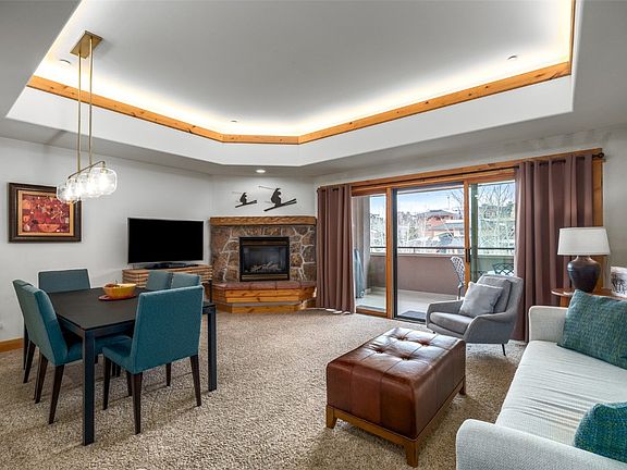 This completely furnished top floor 2 bedroom 2 bathroom Canyon Creek is located on the "quiet" side of the building, away from busy Village Drive, yet still provides lovely views of Emerald Mountain and a peek of the ski area from the balcony. This particular floor plan features an expanded living and dining room area which is enhanced by the high coffered ceilings and panoramic views to the north. Both bedrooms are outfitted with king beds and have generously sized en suite bathrooms with double sinks. High quality finishes throughout the condo include solid granite counters, stainless appliances, and solid wood doors and trim. For a quick warmup on the chilliest days, you can have a seat on the hearth of the gas fireplace to get toasty. Alternately, the large covered balcony is the perfect spot for al fresco dining in the warmer months, with both a view and privacy. Rather than a laundry room like most of the 2 bedroom Canyon Creek condos, this condo has a closet with the full size washer and dryer, which maximizes the living space. Canyon Creek has the feel of a luxurious five star hotel with a parking garage, elevators, a beautiful outdoor pool and hot tub area, and exercise facility, yet the feel of a private residence with exterior entrance doors (versus a stroll down a hotel hallway). Your choice - you can either take an easy 5-10 minute walk to the ski area, or use the shuttle. Either way, Canyon Creek is right in the heart of the base area with Wild Plum and Apres Burger Bistro the first establishments you reach from the sidewalk coming from the building. Private ski lockers on the ground level negate the need to haul your ski gear to your condo. Located in the Green Zone, this condo allows for short term rentals.