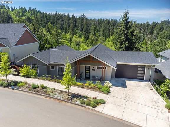 Absolutely stunning eco-friendly custom smart home! Newer construction that harmoniously blends modern luxury with sustainable living. Extremely thoughtful design includes an adaptable multi-generational suite! Step in the front door to main floor living with an open concept kitchen, dining and living room, spacious 10' ceilings, and natural light flooding through large windows, illuminating the beautiful finishes and breathtaking western views of the Pacific Northwest! Walk out the main floor covered patio to relax and take it all in. The gourmet kitchen is a delight, equipped with energy-efficient appliances (ALL included! - see Amenities Sheet!) floor-to-ceiling cabinetry, a generous island that serves as a focal point for cooking and gathering, and a butler's pantry with custom built-in shelving. Imagine hosting unforgettable dinner parties or enjoying casual family meals in this stylish and functional space. Escape to the privacy of the bedroom quarters, where you'll find three well-appointed bedrooms. The master suite is a true oasis, and two additional main floor bedrooms provide versatility and comfort. Main floor laundry is equipped with a dog/utility wash, and included LG washer, pedestal washer and dryer. Main floor also includes a mudroom with built-in shelving, and an extended garage. Downstairs you'll find the bonus/rec room with beautiful views, and continue on to the MIL quarters with its own bedroom, full bath and kitchen including high-end stainless steel appliances. You'll be thrilled to walk out to the screened-in lower level porch, which leads to a large leveled area of grass and mature fruit trees throughout the property! Walk to the end of the gravel path to find a custom fort for all kinds of creativity. Located in a highly desirable neighborhood, this custom home offers the perfect balance of serenity, sustainability and convenience. Enjoy easy access to local amenities, top rated schools, and the University of Oregon.