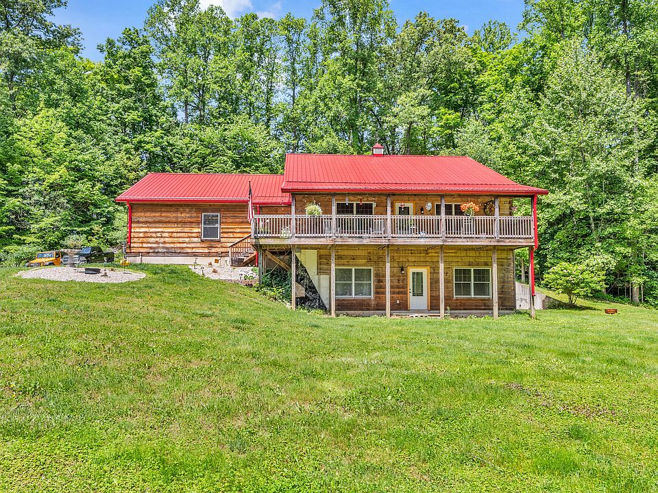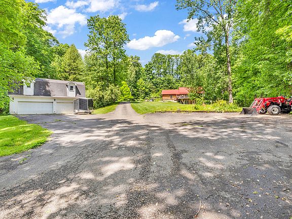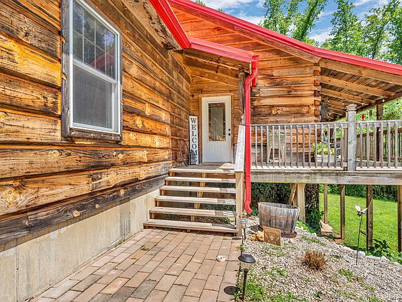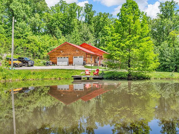 This custom-built log home, crafted in 2014, offers 3,456 sq. ft. of open-concept living on 13 private, wooded acres. Start your mornings with coffee on the rocking chair front porch and end your days soaking in the sounds of nature. Inside, the heart of the home is a dream kitchen with an oversized island, farmhouse sink, high-end appliances-including a double oven with air fry-and beautifully crafted Amish-built soft-close cabinets. The main level features hand-scraped hickory floors, soaring vaulted ceilings, and a cozy stone fireplace. The primary bedroom is a true retreat with private deck access, offering a quiet escape into the trees. The walk-out basement includes a spacious family room and two generously sized bedrooms with walk-in closets. With both an oversized 2-car attached garage and a detached 3-car two story garage, there's plenty of space for hobbies, storage, or guests. This home blends rustic charm with modern comfort-your woodland sanctuary awaits.