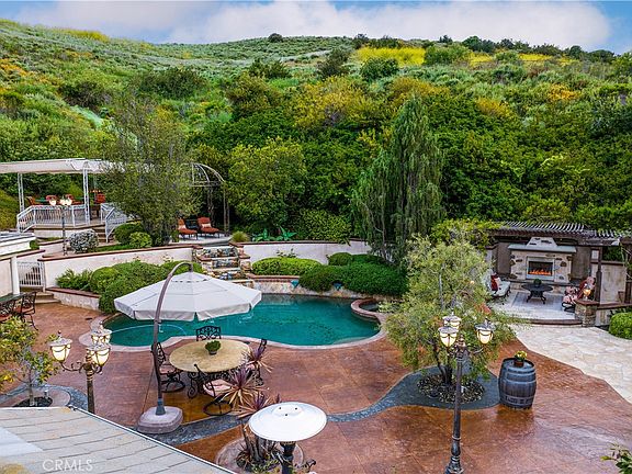 The expansive backyard is a true oasis perfect for everything from intimate family gatherings to large-scale events. The multi-level entertainer's paradise is complete with all the luxuries for ultimate outdoor living: pool, spa, full covered kitchen with built-in BBQ, outdoor movie theater with surround sound, uncovered seating area with a massive limestone fireplace, secluded game/bar area, multiple entertainment & seating areas, & maximum landscaping for ultimate privacy.