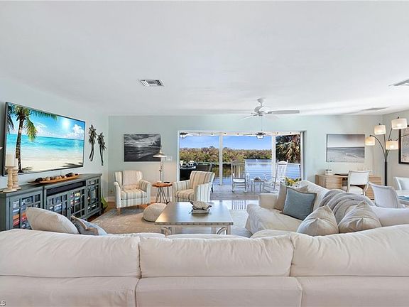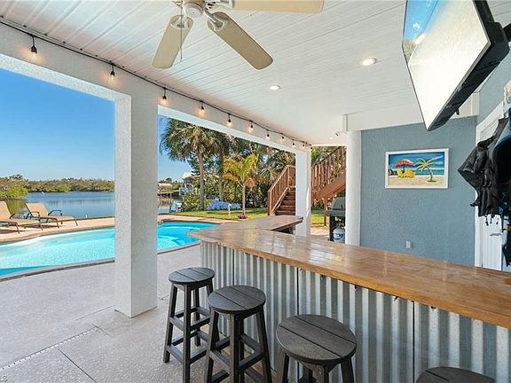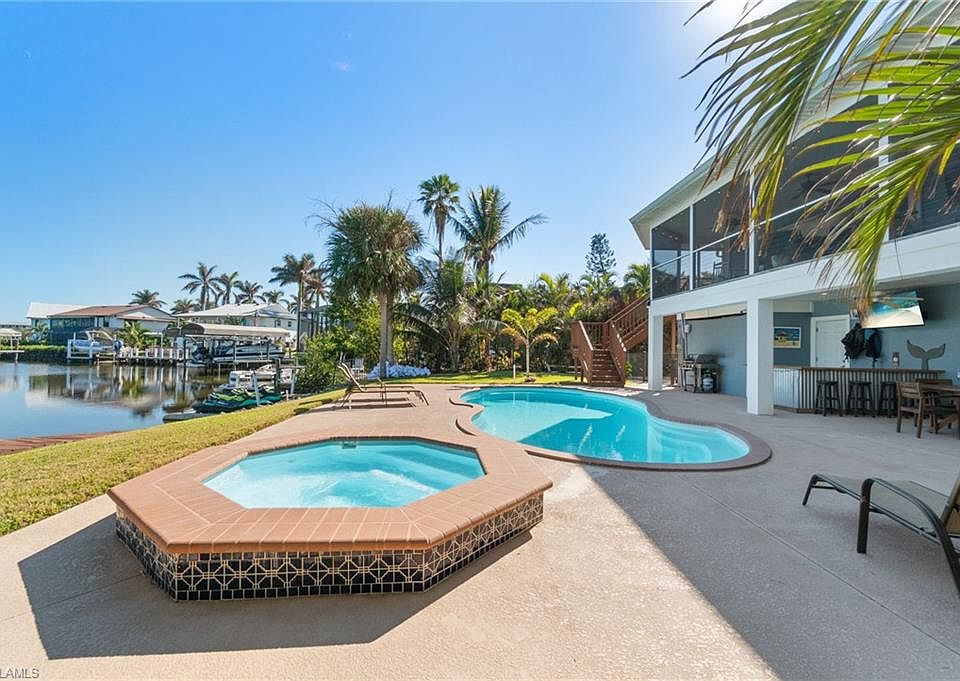 WEEKLY & MONTHLY RENTAL! Escape to the serene beauty of the coast with our charming beach house, the perfect getaway for families, friends, or couples seeking a relaxing beachside retreat. Located just steps away from soft sand & the gentle surf, this spacious home offers breathtaking bay views, modern amenities, and a welcoming atmosphere designed to make your vacation unforgettable. Whether you're looking to unwind with a good book, explore local attractions, or simply listen to the waves, our beach house offers the ultimate coastal escape. Book your stay today & let the sound of the Gulf of Mexico and the beauty of the beach be the backdrop to your next vacation. With 3 bedrooms and 3 full bathrooms, the house comfortably accommodates up to 8 guests. Upon entering the front door & up the stairway, you will be drawn in by the open-concept living space that is flooded with natural light and features comfortable seating, a fully-equipped kitchen, and a cozy dining area, ideal for enjoying meals together. Kitchen offers stainless steel appliances, cookware, dishware and a large island with seating. Sliding glass doors on the main level allow for seamless indoor/outdoor living. The massive outdoor screened balcony is the perfect spot for enjoying the immaculate bay views while enjoying a glass of wine or gorgeous sunrises during your morning breakfast. Our home is within walking distance to some of Bonita Beach's great dining options including Doc's Beach House & Coconut Jack's Waterfront Grille. Main floor features the primary bedroom suite with king bed with bay view and door to outside balcony. Ensuite bathroom has dual vanities and large walk-in glass shower. First guest bedroom has two bunk beds each with a single and twin beds, sleeping four total. In the lower level, the second guest room has a queen bed & ensuite bathroom with vanity & walk-in shower. The laundry is located on ground floor. After a gorgeous day at the beach (or skip the beach!), kick back and relax in the heated backyard pool and spa. For your convenience there is a pool bathroom with walk-in shower & heated outdoor shower. Need a break from the pool atmosphere, just step into the lower second living room level with plenty of seating and kitchenette with small fridge to keep your favorite drinks cold. Fire up the gas grill and get your backyard, poolside family barbeque on. Grab some fishing poles and sit back on the private boat dock and be surprised on how easy you can reel in the big ones! Need kayaks, paddle boards, bikes or e-bikes for your adventure expedition? We can have them delivered for an extra fee. With all of these amenities at your disposal, you'll never want to leave this little slice of paradise. So come and experience the ultimate beach vacation at Beach Therapy, where luxury and comfort come together to create a truly unforgettable experience! Book now, unforgettable beach time memories are waiting for you!