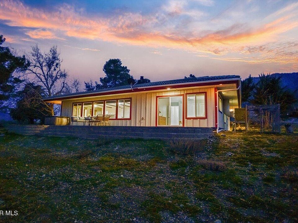 Set against the wide-open skies of Juniper Hills, this home is a quietly striking retreat where thoughtful design meets the freedom of nearly five acres of land. The setting alone is cinematic—panoramic views unfold in every direction, offering a daily reminder of why space, light, and landscape matter. Renovated in 2022, the home feels both grounded and refreshed. Beamed ceilings and built-ins lend warmth and character, while the living room's wood stove anchors the space as a natural gathering point—perfect for cool desert evenings spent watching the light change across the hills from the broad-view windows. The kitchen is modern yet approachable, finished in a two-toned palette with gorgeous Cambria quartz countertops. Sleek appliances include a 36'' Wolf induction cooktop with hood, stainless refrigerator and a convection oven. Ample pantry storage is thoughtfully integrated, keeping the room visually calm while ensuring functionality. The bathroom renovation mirrors this understated sophistication, featuring Cambria quartz counters, a dual vanity, and a walk-in shower designed with both style and practicality in mind. The layout includes two bedrooms with an additional room providing a home office or third bedroom option. Energy-efficient evaporative cooling keeps the home comfortable while staying true to its environment. Beyond the main residence, the property expands into a lifestyle. Two exterior office structures with loft storage offer inspiring work-from-home or creative studio options. RV hookups and covered storage offers plenty of room for vehicles. Abundant open land lends itself naturally to horses and rural living. Adjacent to Devil's Punchbowl, this gated community offers access to extensive trails and proximity to mountain outdoor activities. This is a home that invites you to live a little more intentionally, where mornings begin with expansive views, days unfold with room to breathe, and evenings settle in under a vast, star-filled sky.