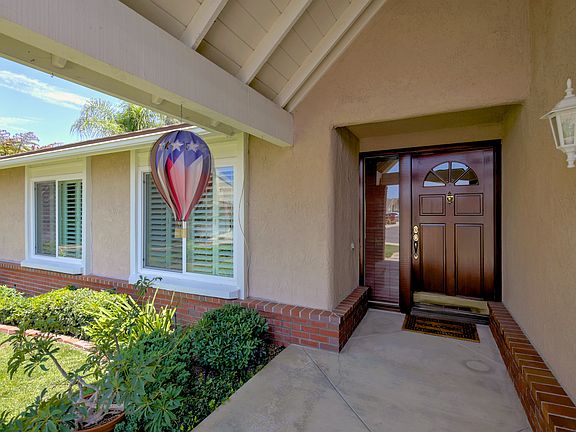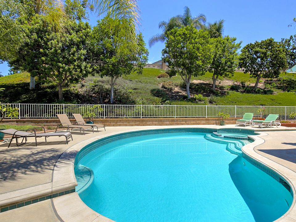 Enjoy wonderful poolside living in the heart of Mission Viejo at this beautifully enhanced one-story home. Located at the end of a tree-lined street at the top of a cul-de-sac, the residence boasts a large homesite of approximately 7,056 square feet with ample room for a recently resurfaced heated pool and spa, an oversized patio with cover that is ideal for al fresco dining, and carefully manicured mature landscaping. A covered walk and entry lead to the open and bright home, which extends approximately 1,549 square feet and immediately impresses with a spacious living room that displays a custom-finished fireplace with mantle and raised hearth, and a vaulted ceiling with beam and skylight. The dining room features a sliding door to the backyard and is adjacent to a remodeled kitchen with elegant granite countertops, custom cabinetry, a pantry, large window with backyard views, and deluxe appliances. Open to the kitchen, a den with slider to the side patio is ideal as a home office or TV room. Three bedrooms and two baths are showcased, including a stylish master suite with access to the backyard, mirrored wardrobe doors, and an updated bath with tile countertop and shower surrounds. Plantation shutters, newer dual-pane windows and sliding doors, ceiling fans, an attached two-car garage, generous storage space, and all appliances and draperies are included. Offering an address in the desirable neighborhood of Castille, the beautiful home is walking distance to a middle school and parks, conveniently located close to large shopping centers, and just minutes from Lake Mission Viejo, which features a community park, beach, clubhouse and trails.