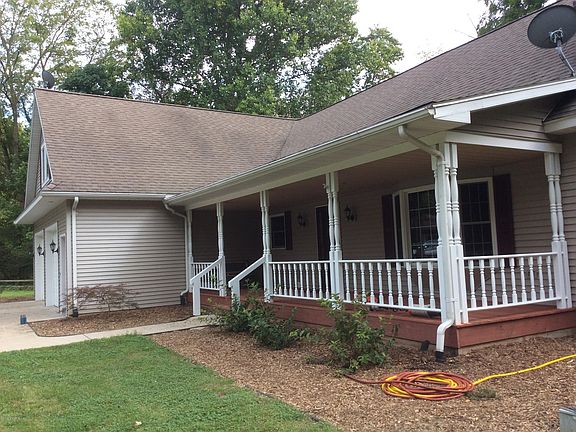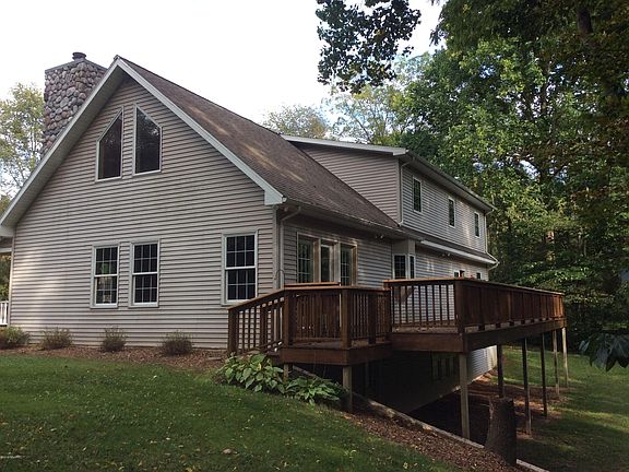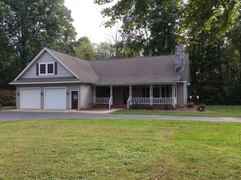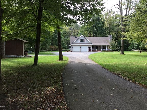 Over 11 acres of total privacy, Wooded ravine setting, with sand bottom creek to fish. Custom Built 4 bedrooms, open concept, retreat has more than you can imagine both inside & out. Perfection to detail in every amenity, you will fall in love with the huge stone fireplace, master bath, main floor laundry and the Knotty pine vaulted Great Room with sliders. Open loft could be office/den etc. Massive 4th bedroom/bonus room over garage. The unfinished LL walks out to ravine & is waiting to finish. 8 x 31 covered porch,12 x 40 wood rear decking overlooking, Creek, Cherry, Pine, very rare Paw Paw & Walnut trees. Wooded trails & fire pit. 56 x 28 pole barn divided into 2 car garage section in 1/2 (mechanics pit in 1 stall) The work shop half has heat, 400 amp service & plumbed for bath.