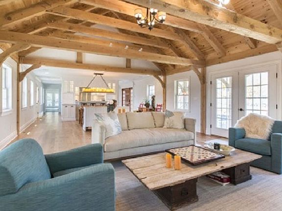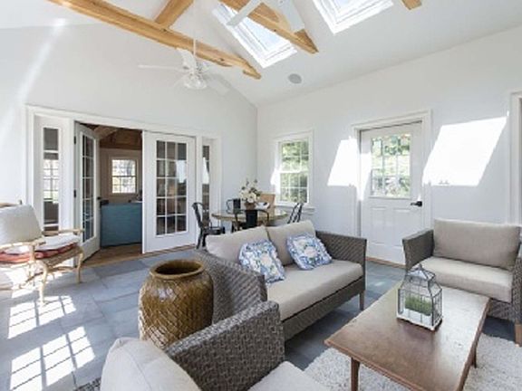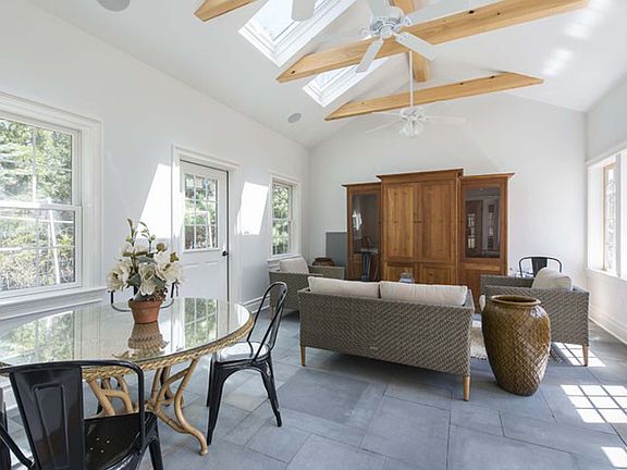 Now available for all of July, and for two weeks in July!! This incredible property was completely re-built in 2014 over the footprint of the original Ludlow Grange Barn. Cool and contemporary, open and light, the interior offers high ceilings and incredible interior and exterior entertaining spaces. The main living spaces are all on one level with three spacious bedrooms and two and one half modern-style baths. The rooms flank an enormous long hall with striking vistas of the cathedral ceiling great-room. The dining area and chef's kitchen are modern, open and bright. You also get a huge upstairs studio with separate bedroom, gym, and living area. The studio is accessed through the outside. The U-shaped residence surrounds a striking English garden, with views over the pool. Heated gunite pool is private and inviting, with grassy vistas on all sides. Note that this property is very quiet and very private and is located down a long driveway, about 500 feet off of the main road.