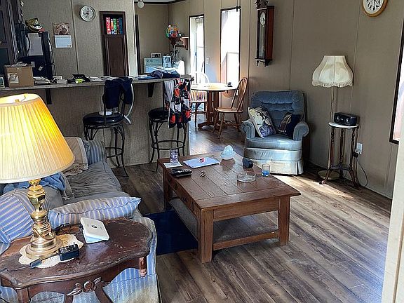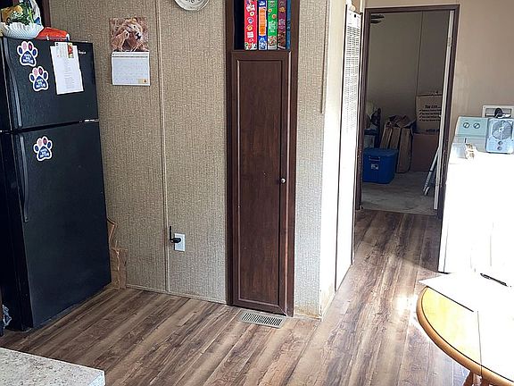 Cozy, well-maintained single-wide mobile home. Hardwood floors throughout and clean carpeting in both bedrooms. Features include a washer and dryer, walk-in closet, and breakfast bar (pictured).