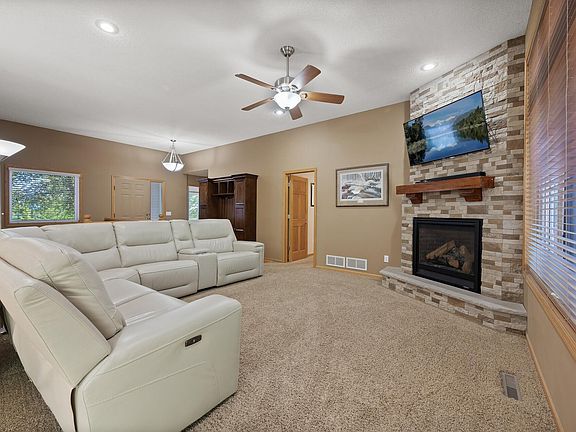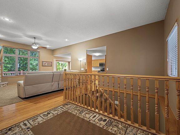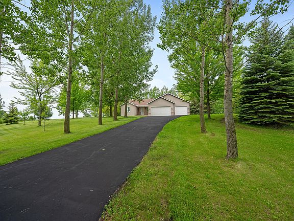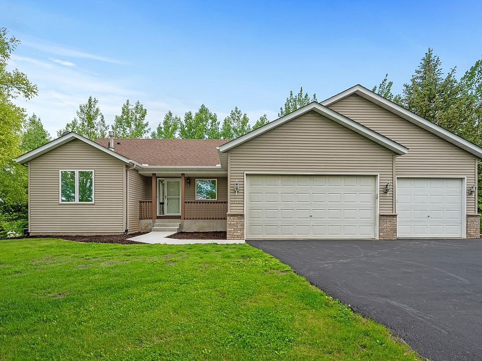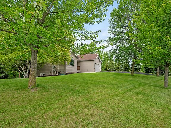 Enjoy country living at its finest. Nestled on over 2 picturesque acres, featuring a long, freshly-coated, tree-lined driveway, and an enormous maintenance-free deck. As beautiful inside as it is outside. This home's interior features warm tones, hardwood floors, a roomy kitchen with granite countertops and stainless steel appliances, and two cozy stone fireplaces. The walkout lower level is plumbed for a wet bar and has a spacious family room with built-in shelves and cabinetry, providing excellent entertainment potential. The master suite features a separate shower and jetted tub, and all three bathrooms in the home are full baths. Its spacious 3-car garage is heated, insulated and includes extra space for a workshop or storage area. New furnace installed, updated lighting and carpeting. Main level windows have removable tint to keep home cool. Easy freeway access to Hwy 35, making this the perfect blend of comfort and convenience. Don't miss it - tour this stunning rambler today!