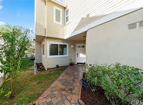 Wonderful open location for this end unit townhome in Highland Park. The landscaped courtyard entry leads to a spacious living room with vaulted ceiling bathed in light from the large slider and dormer windows. The dark engineered wood flooring throughout the entire downstairs compliments the custom white built- ins with TV included, corner gas fireplace with granite hearth, and adjacent dining area with sunny windows and the kitchen. The kitchen has white wood cabinetry, including a full pantry, granite countertops, and stainless steel appliances. The kitchen window overlooks the back patio. The downstairs powder room is next to the direct access garage. The switch back staircase is also wood and leads to the hallway with granite top linen closet and three large bedrooms. The double door master suite has a vaulted ceiling, and adjoining dual vanity, separate shower with custom tile, and walk in closet. Secondary bedrooms are bright and sunny with slider closets. The hall bath has a tub with custom tile surround and granite top counter. The two car garage has side by side washer and dryer hookups, storage and a work bench. The inlaid brick patio has a wrap around grass area and rose garden. Community amenities include a pool, spa, and cabana at the center of the community. Capital inprovements include new PEX plumbing 2018, dual paned windows, newer paint 2018, and newer garage door opener. The second HOA allows access to Mission Viejo Lake and recreation