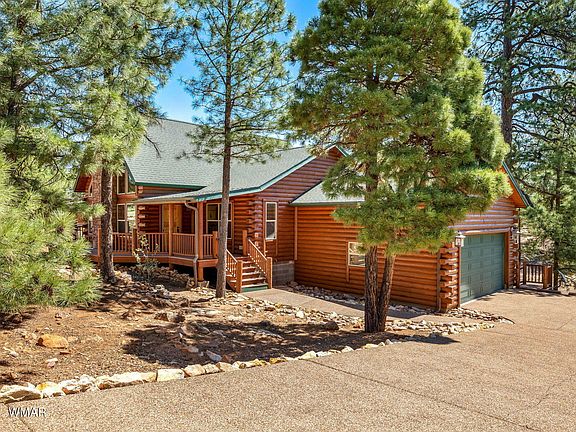 Looking for a full log cabin backing the forest? Look no more after you've seen this spacious 3 BR, 2 BA cabin. Perfectly situated on this Ponderosa filled homesite sits this chalet full log cabin with 2 master suites downstairs (loft is currently being used as 3rd bedroom). Slate tiled floors with carpet in the bedrooms for winter comfort, knotty hickory cabinets, large laundry room and floor to ceiling rocked wood burning fireplace plus peeled pole log railing make it the perfect cabin. Meticulously maintained, lots of decking, exposed aggregate driveway leading you into the side entrance attached 2 car garage are just a few of the extras. The lot has been firewise maintained with a pathway leading to the SECOND 2 CAR DETACHED GARAGE. All this and backing NATIONAL FOREST too in this site built homes only subdivision with underground utilities and paved roads. Don't wait any longer for this dream cabin!