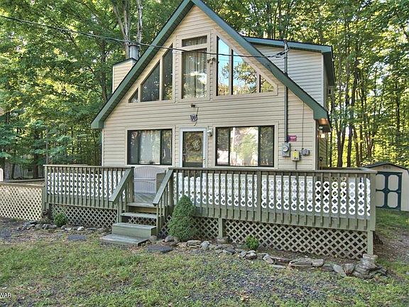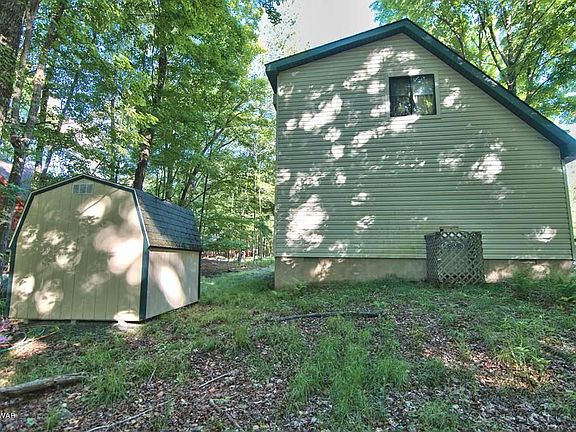 Turn key comes fully furnished. Awesome 3 bedroom, 2 bath chalet home in a four season amenity filled community in The Northern Poconos, just over two hours from the NYC and Philadelphia areas. This easy maintenance vinyl sided chalet is located on a nice level lot in the north section of the community, close to the golf course, club house and indoor recreation center. It's easy access with just a few steps to get in. There's a nice front deck and a storage shed too. The inside has cathedral ceilings, a brick fireplace with propane insert, laminate flooring in the main living area, knotty pine ceilings on the main level,a beautifully updated bathroom on the main level, and a loft overlooking the living room. Dog run too!