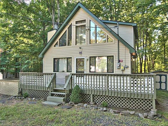 Turn key comes fully furnished. Awesome 3 bedroom, 2 bath chalet home in a four season amenity filled community in The Northern Poconos, just over two hours from the NYC and Philadelphia areas. This easy maintenance vinyl sided chalet is located on a nice level lot in the north section of the community, close to the golf course, club house and indoor recreation center. It's easy access with just a few steps to get in. There's a nice front deck and a storage shed too. The inside has cathedral ceilings, a brick fireplace with propane insert, laminate flooring in the main living area, knotty pine ceilings on the main level,a beautifully updated bathroom on the main level, and a loft overlooking the living room. Dog run too!, Beds Description: 1 BED 2nd, Beds Description: 2+Bed1st, Beds Description: 1 BED 2nd, Baths: 1 Bath Level 1, Baths: 1 Bath Level 2