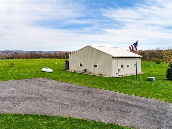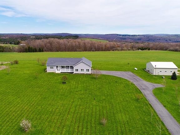 Treat yourself to the beauty of nearly 26 acres of peace & privacy. This flat ranch is surrounded by nature, woods, & panoramic views spanning for miles, yet it's just 6 miles and only minutes to Cazenovia and Manlius. Covered front porch leads to 2100+ square feet of open living space. Quality built with 9 foot ceilings throughout, including the basement, built with 10 poured walls. The foyer leads to an open great room flooded with natural light & overlooks the mile long views. The kitchen has cherry cabinets, and a large eat-in space. There are hardwoods in the kitchen and great room/dining room. Three very large bedrooms including a master with walk in closet and a master bath with beautifully tiled walk in shower and soaking tub. The laundry, mud room & fabulous walk in pantry are located just off the oversized garage. Extremely clean, dry basement with the same 9 foot ceilings provides ample opportunity to finish for additional living space. 40X40 barn with 12 foot ceilings is perfect for a workshop or studio, or for storing equipment, cars, boats.... etc. An energy efficient wood fired boiler creates a wonderful 2nd source of heat for both the home and the barn. 2020-06-09
