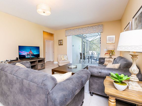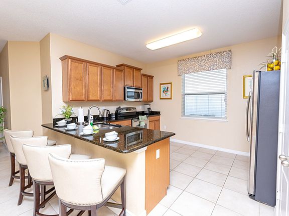 Feel at home in this inviting Kissimmee residence, offering comfort, convenience, and a vibrant palette of colors. Each room is uniquely designed to bring a smile to your face. The kitchen gleams with stainless steel appliances, upgraded small appliances, dishware, flatware, cookware, and all the utensils you need for those days at home. Outside, a covered lanai area with patio furniture for six and sun loungers awaits you to soak up the Florida sunshine. The uniquely shaped pool and spa are ready for your enjoyment, complete with a child safety alarm on the sliding door. A full-size washer and dryer, along with an iron and ironing board, are located in the home for your convenience. The garage game room includes a billiard table, foosball table, and air hockey table, with a table and seating for snacks during family fun time. The home features a variety of bedrooms, each with pillow-top mattresses, upgraded bedding, and linens. Bedroom 1 is a twin room with two twin beds and a flat-screen TV with cable. Bedroom 2 is another twin room with two twin beds, a wall-mounted flat-screen TV with cable, and an en-suite bath. Bedroom 3 offers a queen bed, dresser with mirror, wall-mounted flat-screen TV with cable, and an en-suite bath. Bedroom 4 is a queen bedroom with playful bedding ensembles and a wall-mounted flat-screen TV with cable. Bedroom 5 is a king master bedroom with an en-suite bath, pillow-top mattress, upgraded bedding, linens, and a flat-screen TV with cable. Pool and spa pool heat are available for $50.00 per day and must be purchased for the total length of the stay, requested at least seven days prior to check-in. A BBQ grill is available for $60, with propane gas refill not included. This home is located less than five minutes from Kissimmee's renowned 192 corridors, where shops and restaurants are abundant. It is also a short drive to 429 and the western entrance of Walt Disney World. An easy drive north will take you to the Wizarding World of Harry Potter at Universal Studios. With six theme parks and three waterparks all within a short drive, there is always somewhere to explore. Tuscany At Westside Resort is only a few moments' drive to grocery shopping, restaurants, and other area happenings. Enjoy easy access to major attractions like Walt Disney World Theme Parks (10 min), Universal Studios and Islands of Adventure (23 min), I-Drive (20 min), Legoland (25 min), Premium Vineland Outlet (15 min), and many other attractions. Parties and events are not permitted. Check-in is at 4 pm and check-out is at 10 am. The home is non-smoking and absolutely no pets are allowed. Violation of this term will incur a charge of $400.00 minimum. Starter supplies include one roll of toilet paper per bathroom and small hotel-size bar soap in each bathroom. Items of personal hygiene, dish soap sponge, detergent for dishwasher, laundry detergent, and a garbage bag are provided. There is no daily housekeeping service provided at the rental rate. Before check-in, the unit will be thoroughly cleaned and inspected by a professional cleaning company. Clean sheets and towels will be available in the unit. Mid-stay cleaning services during your stay can be requested for an additional fee. This house is self-catering. Although welcome amenities are provided, it is recommended to stop by the nearest supermarket to purchase additional personal toiletries and desired meals. As per Florida law, open food cannot be left in the refrigerators or kitchen closets, hence all food items will be removed after check-out and no supply of items such as condiments or coffee powder will be provided before check-in. Excessive required cleaning or a double clean is charged at $100.00.