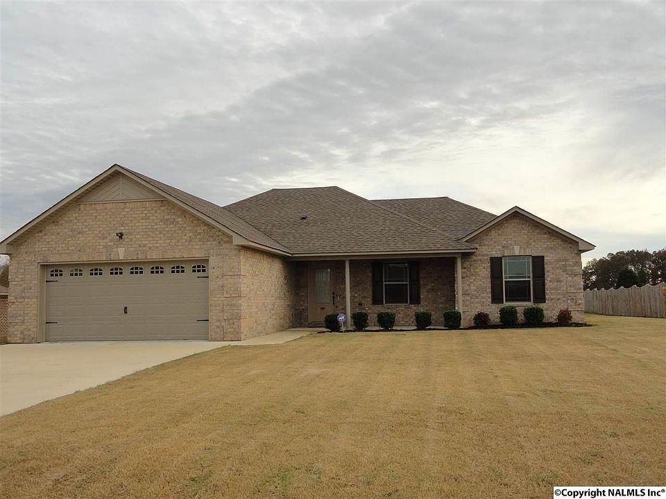 Home is only 2 years old and is still like new, Full brick with 4Br,2Ba.Wood floors and tile in wet areas.Tons of Crown mold and extensive trim package.Dbl trey in Master.Vaulted turtle shell ceiling with mood lights in LR.Breakfast bar in kitchen.SS appliances.Custom made real wood cabinets.Nice soaking tub and separate shower in Master bath.All Blinds and refrigerator remain.Covered back patio and front porch.100% financing with USDA loan.Less than 20 mi.fr Research Park,Arsenal,Hsv, and Madison.